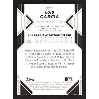 This is a 2019 Bowman Platinum Top Prospects Sky Blue Luis Garcia baseball card. The card is #TOP-21 and pictures show condition. Team(s): Washington Nationals