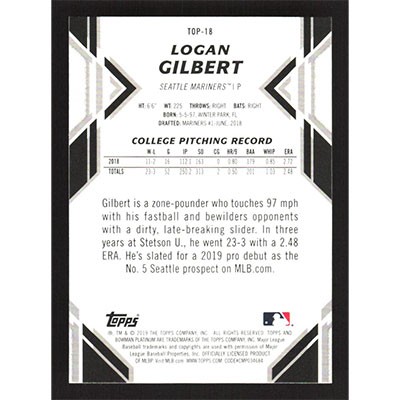 This is a 2019 Bowman Platinum Top Prospects Logan Gilbert baseball card. The card is #TOP-18 and pictures show condition.