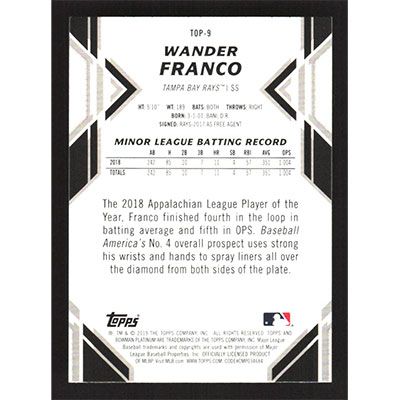 This is a 2019 Bowman Platinum Top Prospects Wander Franco baseball card. The card is #TOP-9 and pictures show condition.