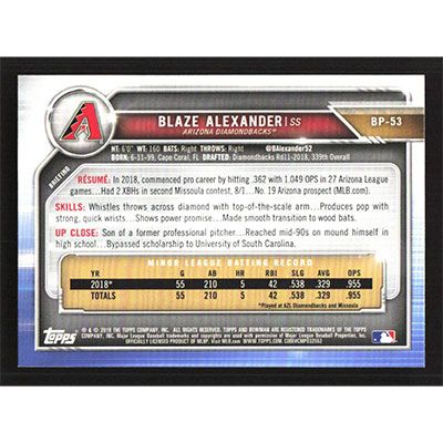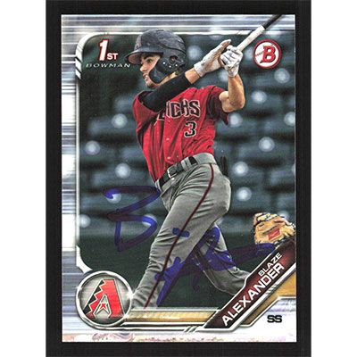 This is a 2019 Bowman Prospects Blaze Alexander autographed baseball card. This card has been signed, in blue, by Blaze Alexander, and is guaranteed authentic by Ballcardz.com. The card is #BP-53 and pictures show condition.