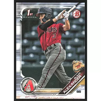 This is a 2019 Bowman Prospects Blaze Alexander baseball card. The card is #BP-53 and pictures show condition.