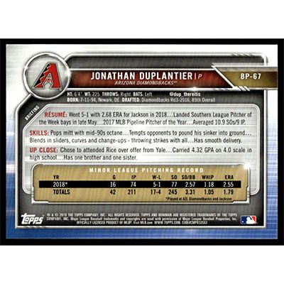 This is a 2019 Bowman Prospects Jon Duplantier baseball card. The card is #BP-67 and pictures show condition.