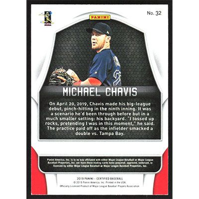 This is a 2019 Certified Green Michael Chavis baseball card. The card is #32 and pictures show condition.