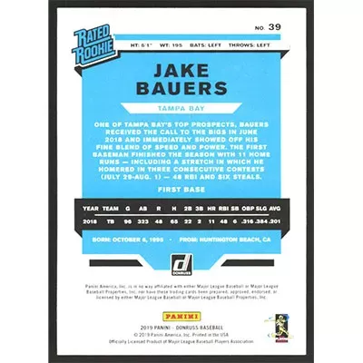 This is a 2019 Donruss Jake Bauers Rated Rookie baseball card. The card is #39 and pictures show condition. Team(s): Tampa Bay Rays Rookie Card (RC)