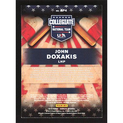 This is a 2019 Donruss American Pride Vector John Doxakis baseball card. The card is #AP4 and pictures show condition.