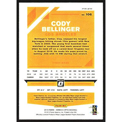 This is a 2019 Donruss Optic Carolina Blue and White Cody Bellinger baseball card. The card is #106 and pictures show condition. Team(s): Los Angeles Dodgers