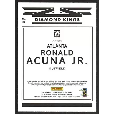 This is a 2019 Donruss Optic Holo Ronald Acuña Jr. Diamond Kings baseball card. The card is #16 and pictures show condition.