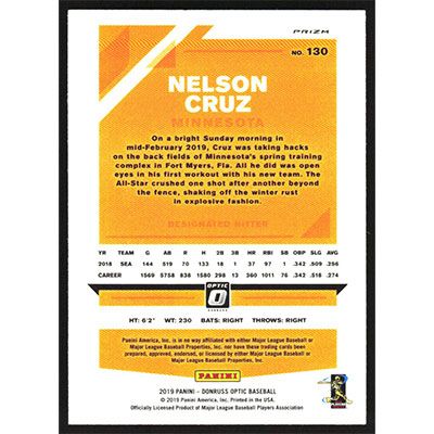 This is a 2019 Donruss Optic Lime Green Nelson Cruz baseball card. The card is #130 and pictures show condition.