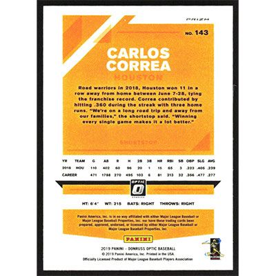 This is a 2019 Donruss Optic Lime Green Carlos Correa baseball card. The card is #143 and pictures show condition.