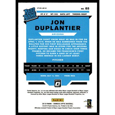 This is a 2019 Donruss Optic Lime Green Jon Duplantier Rated Rookie baseball card. The card is #85 and pictures show condition. Team(s): Arizona Diamondbacks Rookie Card (RC)