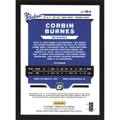 This is a 2019 Donruss Optic The Rookies Corbin Burnes baseball card. The card is #TR-6 and pictures show condition. Team(s): Milwaukee Brewers Rookie Card (RC)