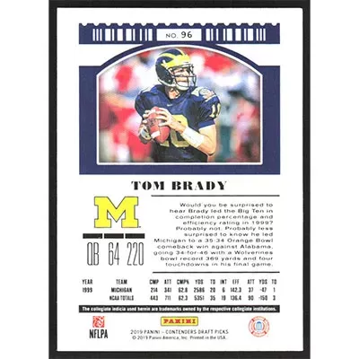 This is a 2019 Panini Contenders Draft Picks Tom Brady football card. The card is #96 and pictures show condition.