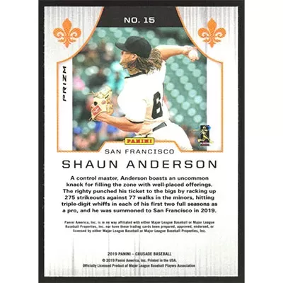 This is a 2019 Panini Crusade Holo Shaun Anderson baseball card. The card is #15 and pictures show condition. Team(s): San Francisco Giants Rookie Card (RC)
