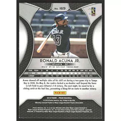 This is a 2019 Panini Prizm Ronald Acuña Jr. baseball card. The card is #169 and pictures show condition.