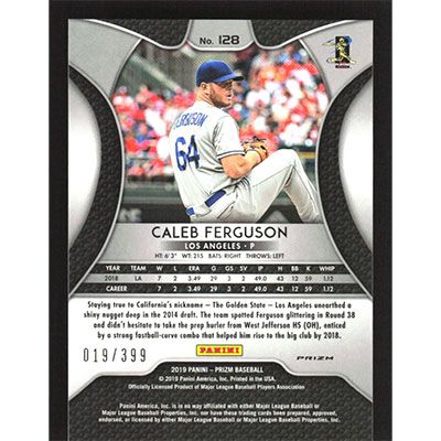 This is a 2019 Panini Prizm Blue Mojo Caleb Ferguson baseball card. The card is #128 and pictures show condition. This card is limited; #'d 019/399. Team(s): Los Angeles Dodgers Rookie Card (RC)