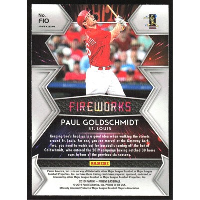 This is a 2019 Panini Prizm Fireworks Silver Paul Goldschmidt baseball card. The card is #F10 and pictures show condition.