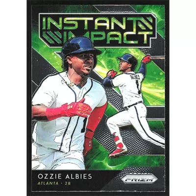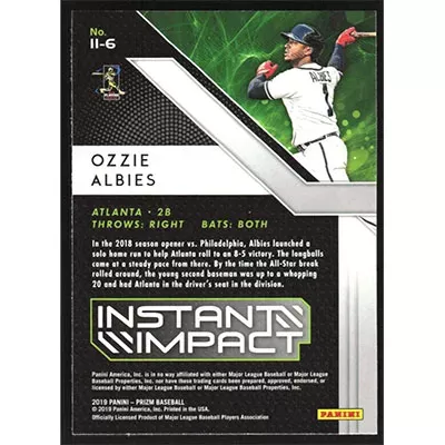 This is a 2019 Panini Prizm Instant Impact Ozzie Albies baseball card. The card is #II-6 and pictures show condition.