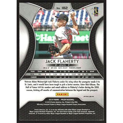 This is a 2019 Panini Prizm Pink Jack Flaherty baseball card. The card is #182 and pictures show condition.