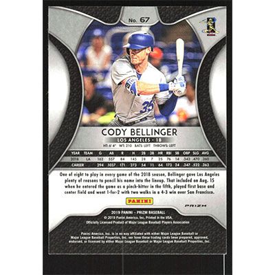 This is a 2019 Panini Prizm Purple Cody Bellinger baseball card. The card is #67 and pictures show condition.