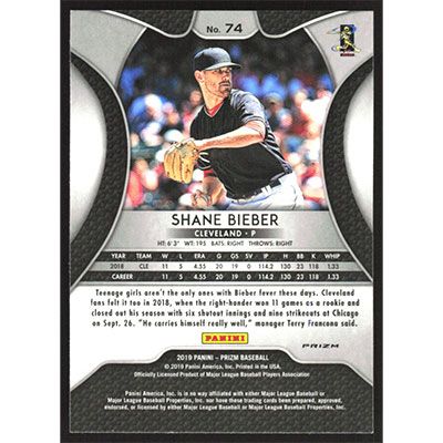 This is a 2019 Panini Prizm Purple Shane Bieber baseball card. The card is #74 and pictures show condition.