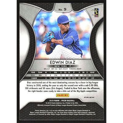 This is a 2019 Panini Prizm Purple Edwin Diaz baseball card. The card is #9 and pictures show condition.