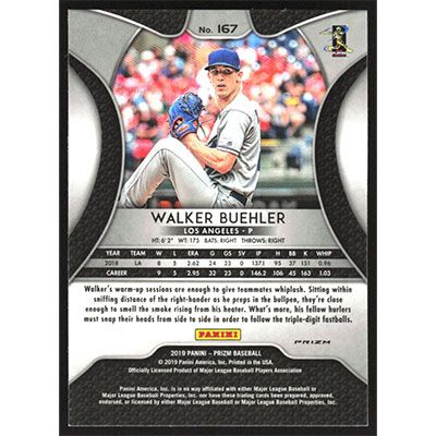 This is a 2019 Panini Prizm Red White and Blue Walker Buehler baseball card. The card is #167 and pictures show condition.