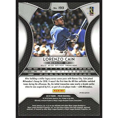 This is a 2019 Panini Prizm Red White and Blue Lorenzo Cain baseball card. The card is #193 and pictures show condition.