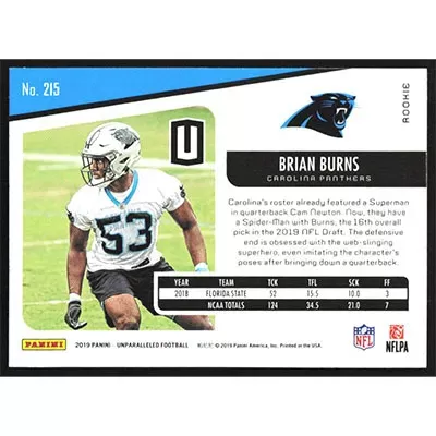 This is a 2019 Panini Unparalleled Brian Burns football card. The card is #215 and pictures show condition.