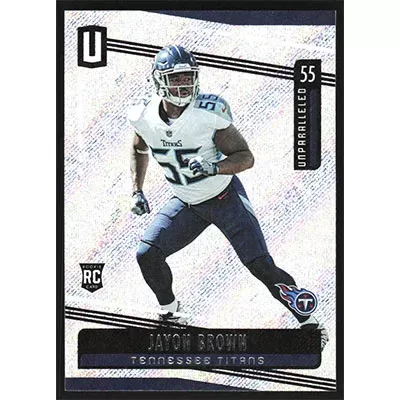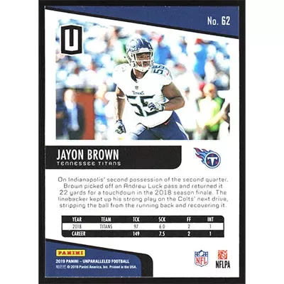 This is a 2019 Panini Unparalleled Jayon Brown football card. The card is #62 and pictures show condition.