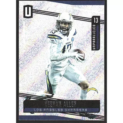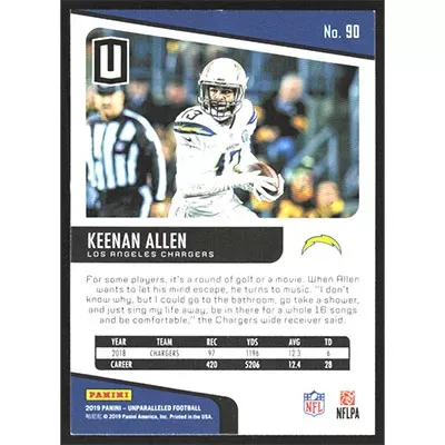This is a 2019 Panini Unparalleled Keenan Allen football card. The card is #90 and pictures show condition.