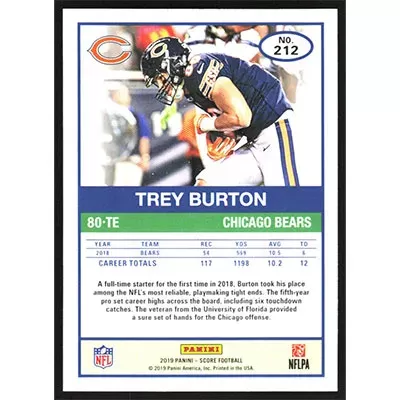 This is a 2019 Score Trey Burton football card. The card is #212 and pictures show condition.