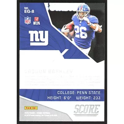 This is a 2019 Score Epix Game Saquon Barkley football card. The card is #EG-8 and pictures show condition.