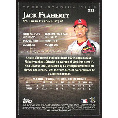 This is a 2019 Stadium Club Jack Flaherty baseball card. The card is #211 and pictures show condition.