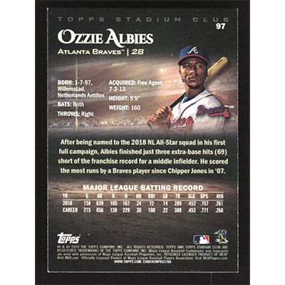 This is a 2019 Stadium Club Ozzie Albies baseball card. The card is #97 and pictures show condition.