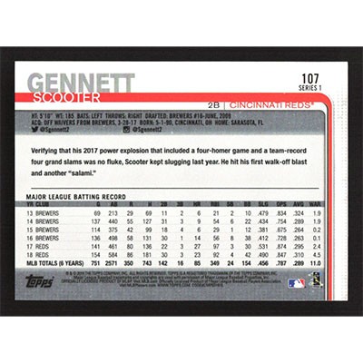 This is a 2019 Topps Scooter Gennett baseball card. The card is #107 and pictures show condition.
