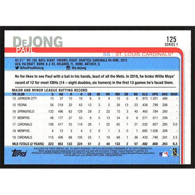 This is a 2019 Topps Paul DeJong baseball card. The card is #125 and pictures show condition.