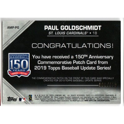 This is a 2019 Topps 150th Anniversary Manufactured Patches 150th Anniversary Paul Goldschmidt baseball card. The card is #AMP-PG and pictures show condition. This card is limited; #'d 005/150.