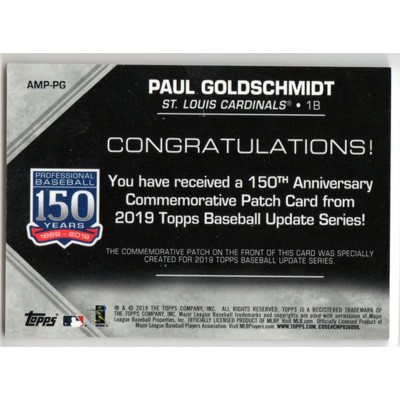 This is a 2019 Topps 150th Anniversary Manufactured Patches Paul Goldschmidt baseball card. The card is #AMP-PG and pictures show condition. Team(s): Arizona Diamondbacks