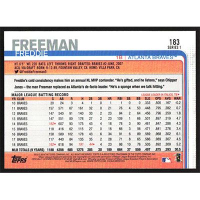 This is a 2019 Topps Freddie Freeman baseball card. The card is #183 and pictures show condition.
