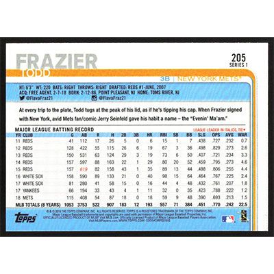 This is a 2019 Topps Todd Frazier baseball card. The card is #205 and pictures show condition.
