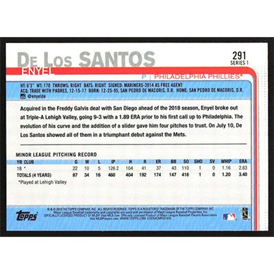 This is a 2019 Topps Enyel De Los Santos baseball card. The card is #291 and pictures show condition.