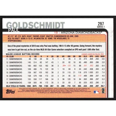 This is a 2019 Topps Paul Goldschmidt baseball card. The card is #297 and pictures show condition.