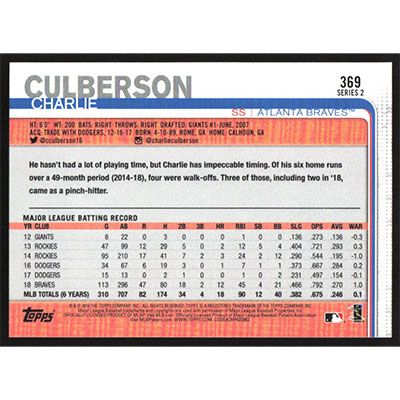 This is a 2019 Topps Charlie Culberson autographed baseball card. This card has been signed, in blue, by Charlie Culberson, and is guaranteed authentic by Ballcardz.com. The card is #369 and pictures show condition.