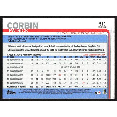 This is a 2019 Topps Patrick Corbin baseball card. The card is #510 and pictures show condition.