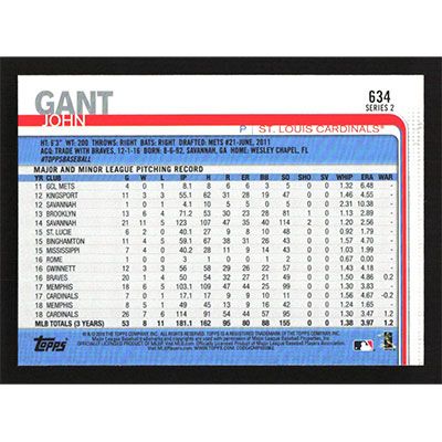 This is a 2019 Topps John Gant baseball card. The card is #634 and pictures show condition.