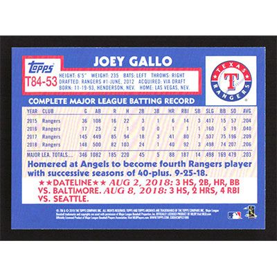 This is a 2019 Topps '84 Joey Gallo baseball card. The card is #T84-53 and pictures show condition.