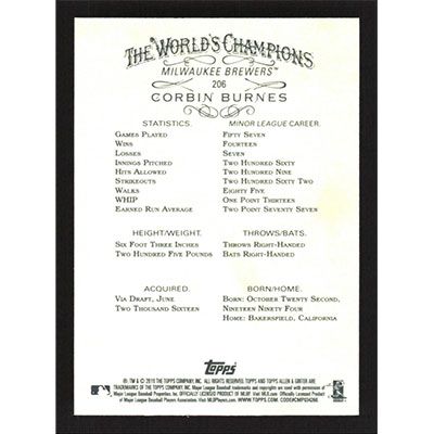 This is a 2019 Topps Allen & Ginter Corbin Burnes baseball card. The card is #206 and pictures show condition. Team(s): Milwaukee Brewers Rookie Card (RC)