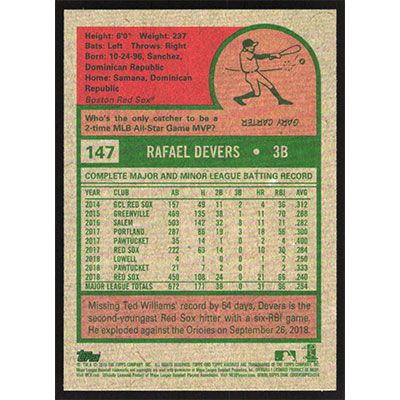 This is a 2019 Topps Archives Rafael Devers baseball card. The card is #147 and pictures show condition.