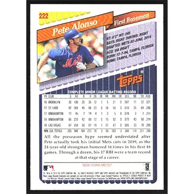 This is a 2019 Topps Archives Pete Alonso baseball card. The card is #222 and pictures show condition.