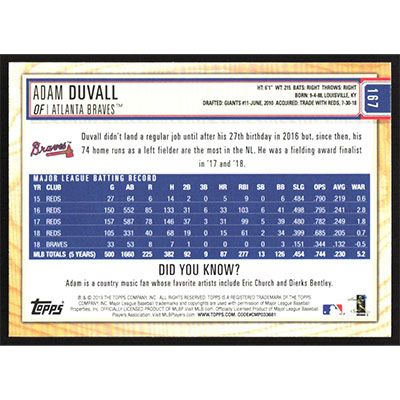 This is a 2019 Topps Big League Adam Duvall baseball card. The card is #167 and pictures show condition.